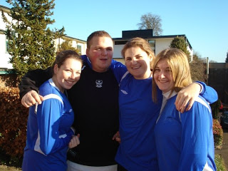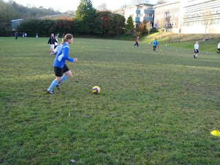 I realised my blog title is wheezy footie chick and I ahve actually got no photos of me playing football. I played football the other day. Stupid yes but I enjoyed it. My knee held up so Im glad. Anyway here is me playing football. It was a five aside tournament whihc ended up just being two teams from our uni football side playing against each other.