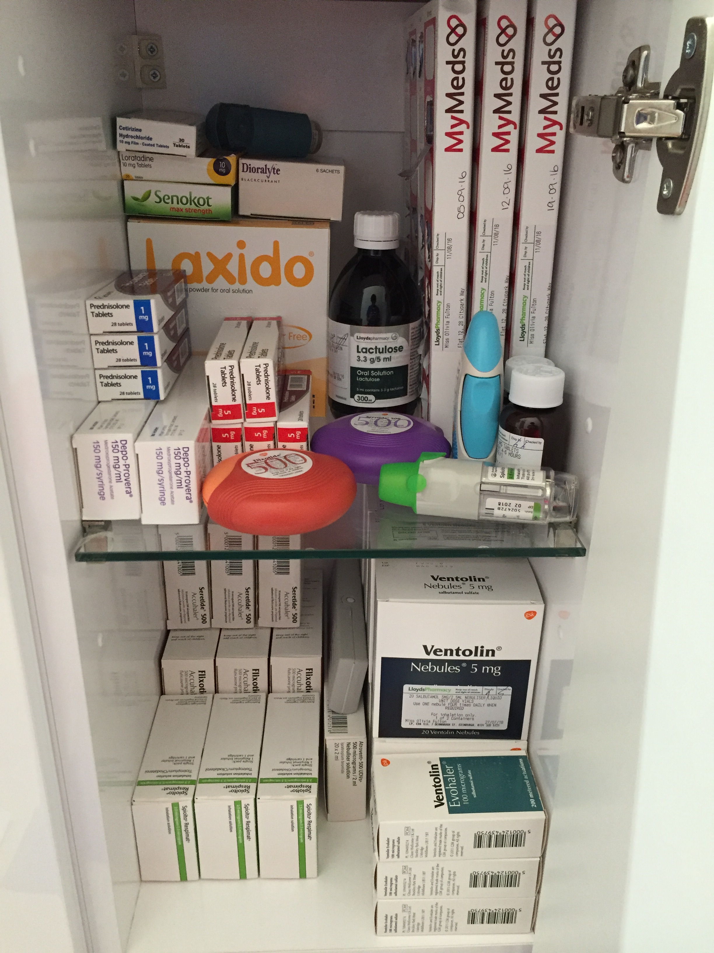 The reason I wrote this out was because I just picked up my meds as I wrote in the start and I organised them into my cupboard to make them all neat and so I know what is where. I was getting lost with the meds and what I was taking when. It was over whelming but my pharmacist has reduced that a lot by sorting my meds out weekly but they were also all in a box just chucked in so never knew what I had and what I was running out of. Now they are neat in a cupboard which I can close the door on. Closing the door- after some carful tetris packing because it wouldn’t shut the first time round, made me think about what we hide from the outside. What is our own reality and what is the reality that we allow people to see. My life on the outside is very different to life in my flat. I find when I am at home I am resting and doing treatment to allow myself to go out and about and be with friends or coach or something else. It is like two polar worlds- one which is in preparation of going out or the recovery of being out and then the being out and doing things. Its keep the private and the public separate until you read this and realise that asthma is not just asthma but it is much bigger. It is life changing, life threatening, life limiting.