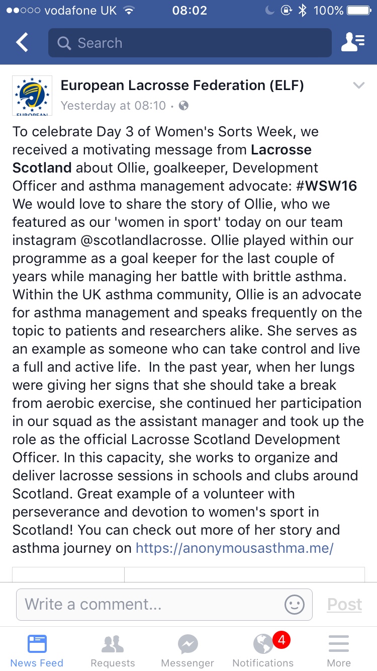 This was totally unexpected but I am really proud of it and it has given me a boost to just keep doing what I am doing. But later in the week more was to follow. I saw the European Lacrosse Federation also featured me on day three of Women in Sport week. I was really stunned as other features previously were whole teams not just one person. I am really touched and honoured for them to have recognised what I have been doing and if this can put Lacrosse on the map more but also how devastating asthma can be but also the opportunities that asthma can give you!