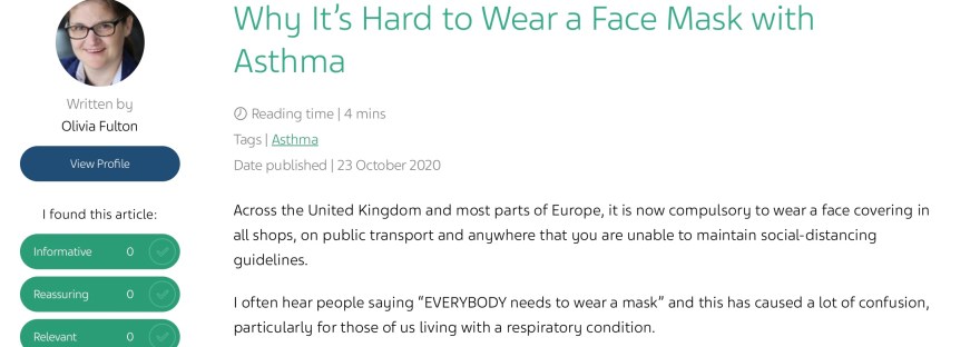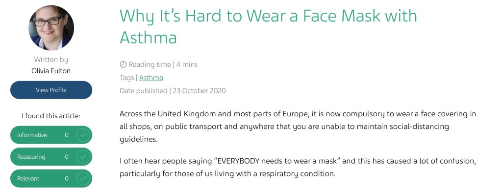 I am very fortunate that I write for TEVA Pharmaceuticals Life Effects Platform about my experience of living with severe asthma.