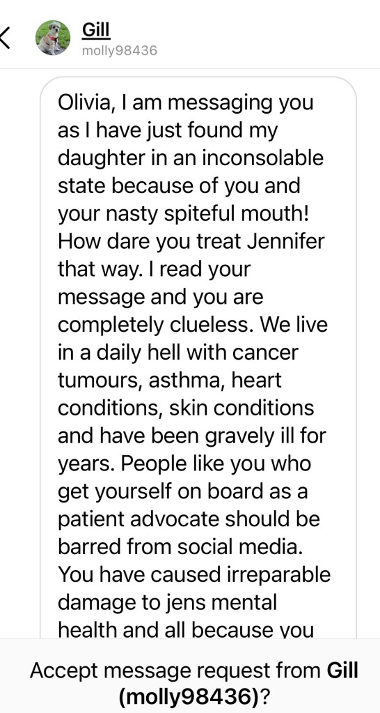 It has really rocked me a lot and while I am not feeling great it makes me question why do I bother doing what I do but also it has made me realise that as patient advocates we are very vulnerable and there is no union or anything that we can turn to for help. If the screenshots above had been sent to me regarding the situation at work I would have had support and potentially action could be taken but not now. I am an island that is connected to a network of other advocates who shockingly have all had similar situations. This really bothers me more than the situation itself. All we can do is block and move on but as in the work situation people can always make new accounts, or as I have heard from other advocates people make fake accounts. Blocking etc is all very well but it stays with you like this has.