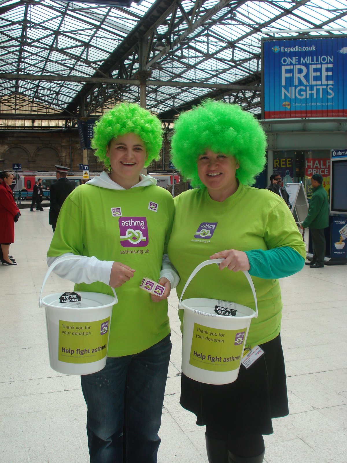 From 2006 onwards I had a lot of involvement with Asthma UK doing a range of different things which increased as my asthma got worse and I was being limited by what I could do as I could always do something to help the charity. One of the first things I do remember doing was raising public awareness of Asthma UK and asthma, this involved a bucket collection at Waverley Station in Edinburgh. I remember it so clearly because I was dressed in a lime green t-shirt and neon green curly wig!