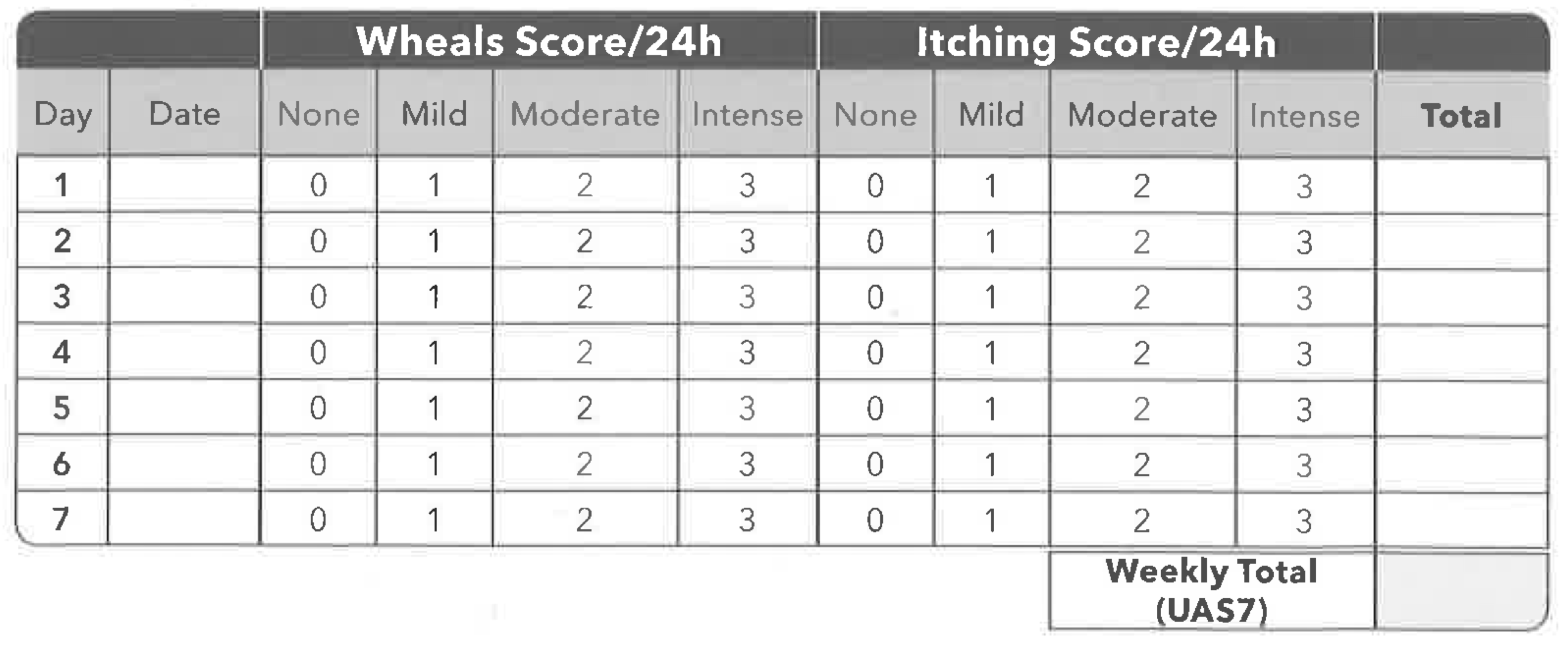 A few weeks before I started omalizumab I needed to start doing the Urticaria Activity Score-7 (UAS7) and I continue to do it to monitor how my urticaria is on a day to day basis. The UAS-7 is simple and not time consuming at all, much like doing your peak flow for asthma. The UAS-7 scores you based on the number of hives you have and how itchy they were, you get a score for both parts and total these up weekly to give you an overall score. The hope is that this score reduces while you are on omalizumab. Some people have found their score can drop to 1/4 or 1/3 of their starting score. I have noticed a significant difference already with my average score originally around 34 where as this week my score was 15.
