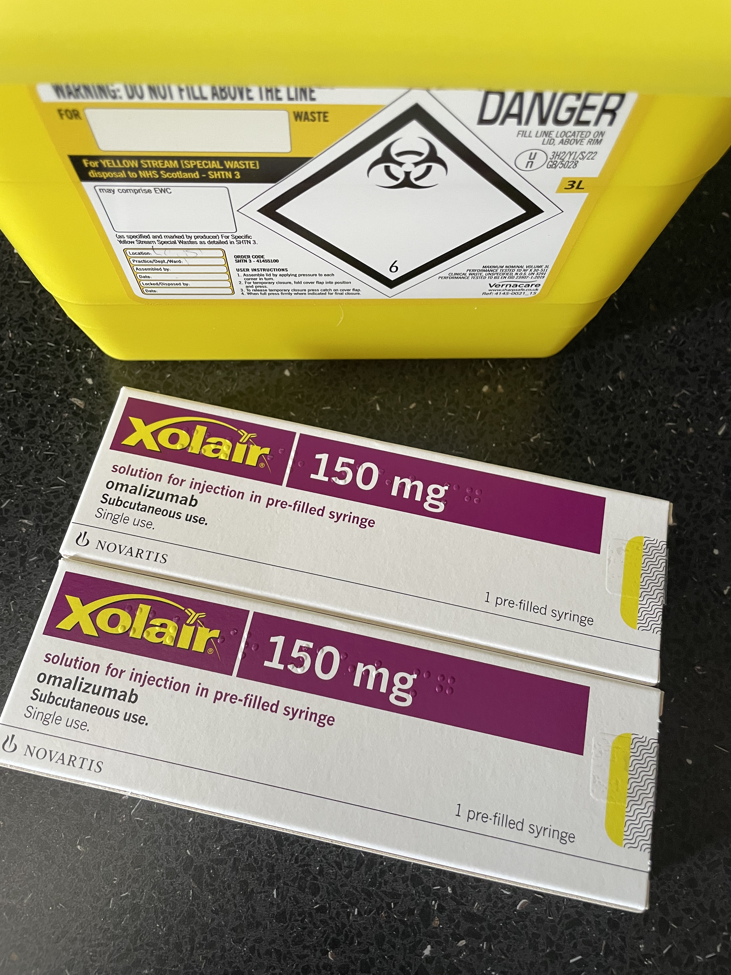 This is where I get puzzled because the criteria for Xolair for severe asthma is based on objective data as it is based on an exact number or range that your blood serum IgE needs to be however to be considered for Xolair for urticaria it was very much based on subjective data. I had to fill in a diary called the Urticaria Activity Score 7 (UAS7) where I would record the number of hives I had in that day and then also record the severity of the itch too. At the end of each week I would total the scores from each day. Based on this subjective data my consultant decided I would start Xolair. It was very much based on my perspectives of the urticaria rather than an exact number present in my blood like you need for severe asthma. Don’t get me wrong I am very very grateful that for the urticaria I was able to be put on Xolair because its effects have been life changing not only for my urticaria but also my asthma too. I doubt I would have had the positive effects and better control of my asthma if it were not for being on Xolair however I would never have got the chance to try Xolair and get the positive effects if I did not have urticaria.